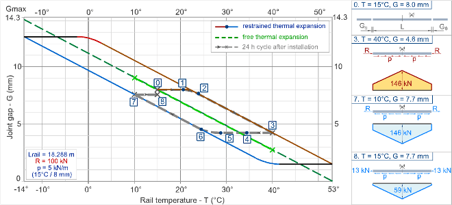 For the simplified theoretical model of the free thermal expansion track superstructure this theoretical rail temperature cycle can be run with any other temperature variations. Every time the rail temperature will reach again 15°C the joint gaps will be 8 mm. The linear relation between rail temperature and joint gap will always be maintained.