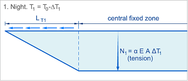 During the night, the temperature falls to a minimum T1 and in the central fixed zone of CWR a constant tension force is developed, since no rail contraction can occur.
