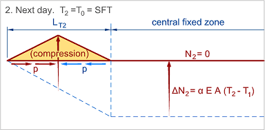 The next day the rail temperature is presumed to return to the stress-free temperature (T2 = T0 = SFT). On the central zone the thermal force returns to zero. On the stress transition zone the rail will tend to expand, the longitudinal resistance (p) is activated to oppose this tendency and will retain a variable compression force induced by the increase in temperature from T1 to T2. Even though the rail has now returned to the original installation temperature and on the central fixed zone there is no thermal force present (N2 = 0), there is a thermal compression force on the stress transition length developed over night due to the temperature increase from T1 to T2. This might sound strange – the rail temperature has not yet increased above the installation (stress free) temperature, however, in the rail there is already a compression force.