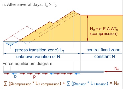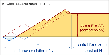 After several days of rail temperature variations, the stress transition zone (LT) develops further and its length can no longer be accurately evaluated. The rail thermal force variation over this zone becomes irregular and will never again be null, at least not until a new natural re-stressing is undertaken. Within its length, it can contain higher thermal forces than the ones in the central zone and even have a combination of both compression and tension force sections at one and the same time.