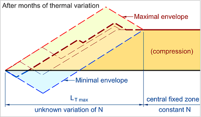 In time, the length of this zone grows further reaching a maximum value (LTmax) , specific for each railway network. Within this maximum stress transition zone the thermal force is irregular and unknown. However, it is theoretically accepted to be contained within a range (between a maximal and minimal envelope) defined, among other factors, by the average value of the track longitudinal resistance.
