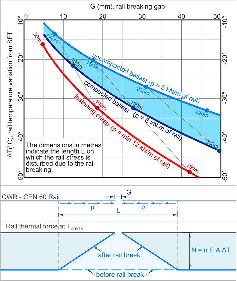 The graph above shows the relation between the break gap, the track longitudinal resistance and this rail temperature difference. It also indicates, indicatively, the length, L, on which the rail thermal force is disturbed. This presumes that the rail break occurs within a fixed zone of CWR and not on a stress transition, where the thermal stress is irregular and potentially higher than the practically constant found in the central fixed zone of CWR.