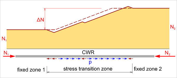 1. Stress transition zone caused by rail temperature changes. These can be encountered in areas of CWR track where there is a consistent rail temperature difference between adjacent CWR sections. For example: