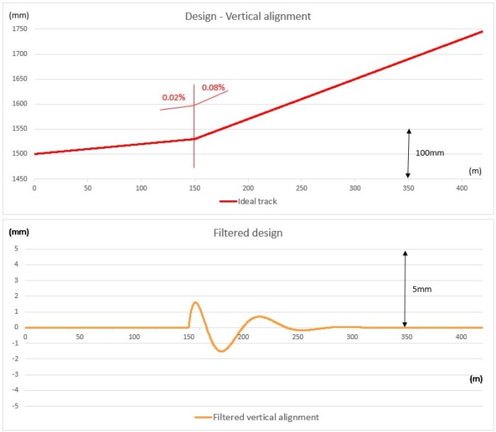 Figure 5 illustrates this issue for a gradient change. The filtered output is practically null except an almost invisible variation that starts at chainage 150m and extends to 250m.