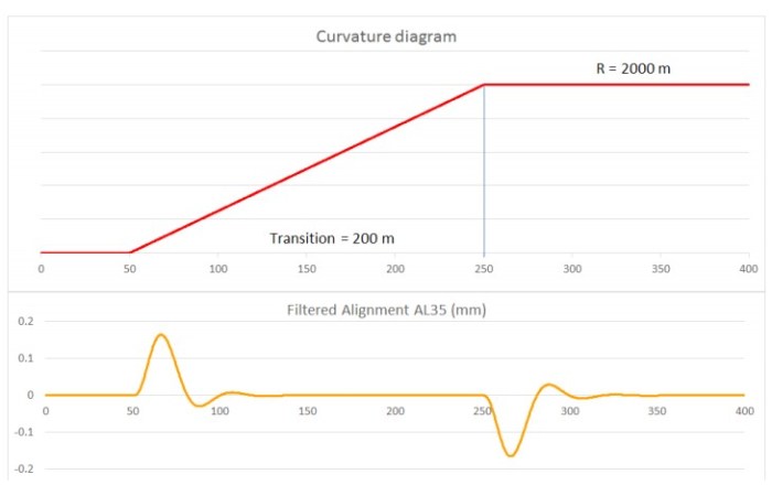 Similar artefacts (filtering errors) are generated by the Butterworth Filter at every change from a design element to another. Figure 8. shows another example for two changes – one from straight to a transition curve and another from transition to a 2000m radius.