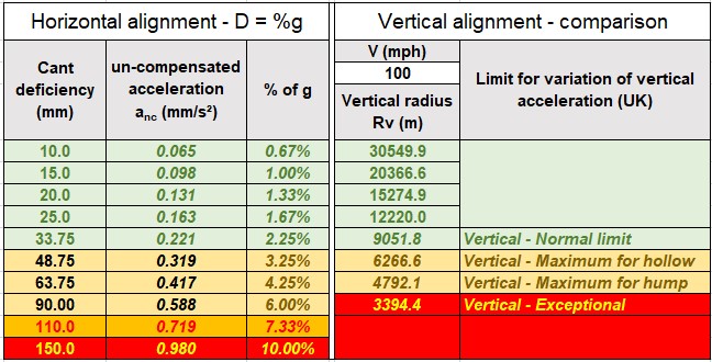 With this formula we can now compare the limits we have to cant deficiency with the ones we have for vertical curves (UK rules exemplified here):