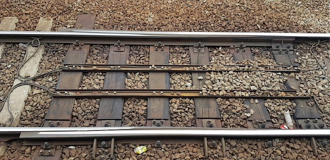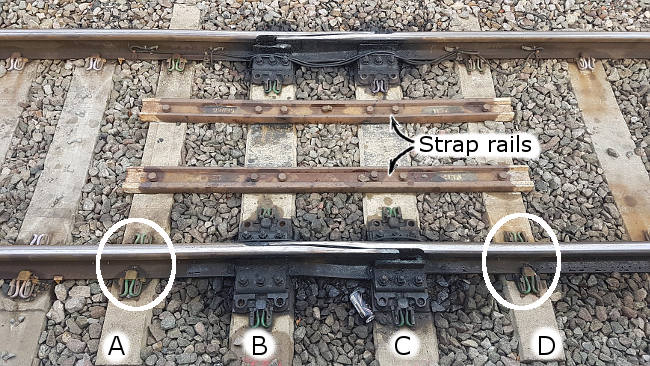 This is why, I think, those strap rails are installed – to keep the four sleepers parallel and to allow the device to work as designed. There is a price for this – some stress passes across (not much, the fastening longitudinal resistance of one sleeper).