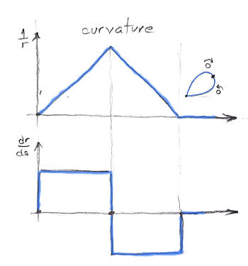 On the other, the curvature diagram of this curve is not the sharp triangle of the mirrored clothoids. It looks like this (not to scale – the diagram is distorted for illustration and due to the incredible talent of the artist):